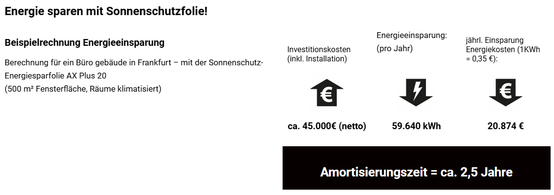 Die Sonnenschutzfolien können Energiekosten einsparen, da im Sommer Klimaanlagen entlastet oder sogar vollständig ersetzt werden können. Eine Beispielrechnung zur Energieeinsparung finden Sie weiter unten auf der Seite. - UV-Schutz